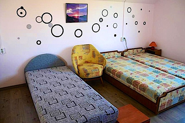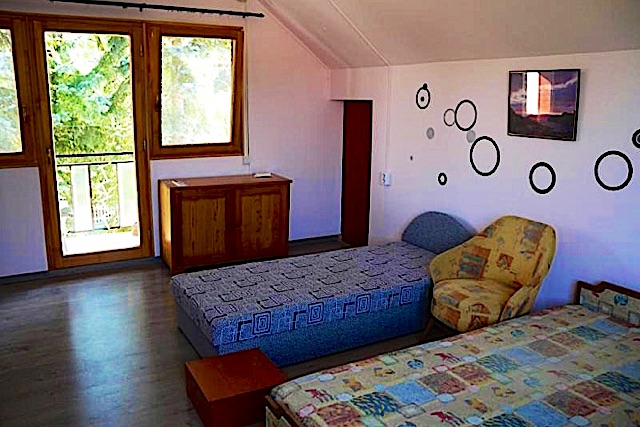 A kellemesen hűvös, kábeltévés, fűthető, erkélyes ház teljesen felszerelt, elől és hátul fedett terasz van. A földszinten 2 szoba, konyha, fürdőszoba, nappali található, az emeleten 1 nagy szoba 4 ággyal, mosdóval, vécével. Kerti bútorok, tusoló, hintaágy, függőszék, trambulin, homokozó, lengőteke, csocsó, bográcsozási, grillezési lehetőség adott. A Balaton az utca végében levő lejárón elérhető. Az utca nyugodt, nem forgalmas.
