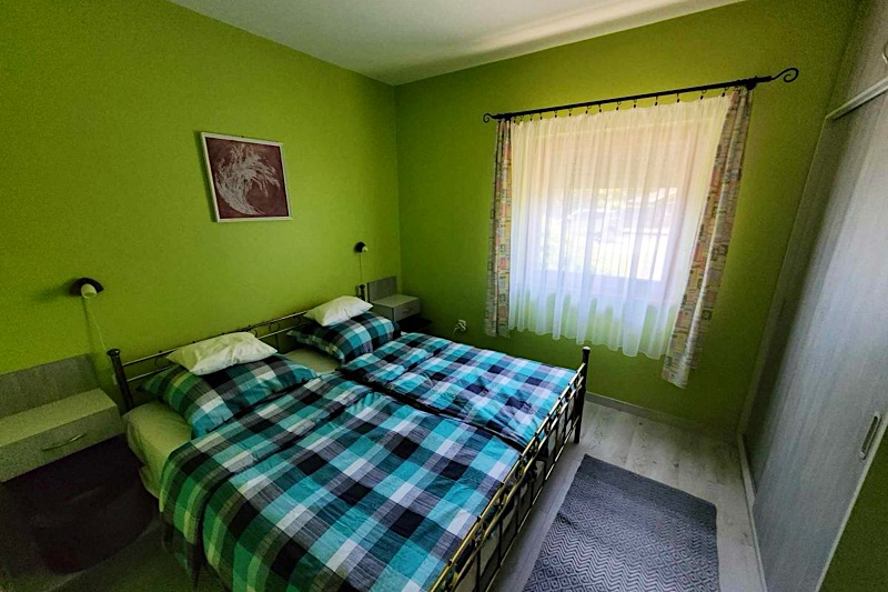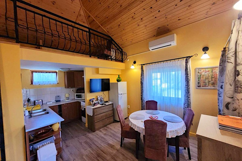 Teljes belső felújításon átesett vendégház vízparti, aszfaltozott út mellett, földszintes, vezetékes vízzel, hűtő-fűtő klímával ellátott. A nyaralóban 2 hálószoba, galéria, nappali- konyha, fürdőszoba, 2 db WC és 20 négyzetméteres fedett terasz szolgálja a vendégek kényelmét. A szobák 2-2 férőhelyesek Franciaágyas 1 db 180×200 ágy, 2 db 1 személyes 90×200 ággyal, valamint nagyméretű gardróbszekrényekkel. A galérián 2 db 1 személyes ágy. Igény esetén babaágy, etetőszék.