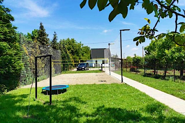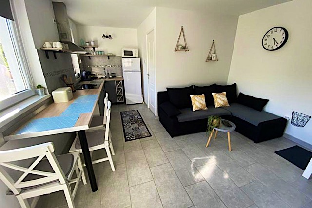 Az épület 4 fő elszállásolására alkalmas, klimatizált. Az emeleten egy hálótér helyezkedik el 3 fő részére, lent pedig egy kihúzható kanapé szolgál pótágyként. A konyha jól felszerelt, fagyasztós hűtő, mikró, főzőlap, kenyérpirító, kávéfőző gondoskodik a komfortról.