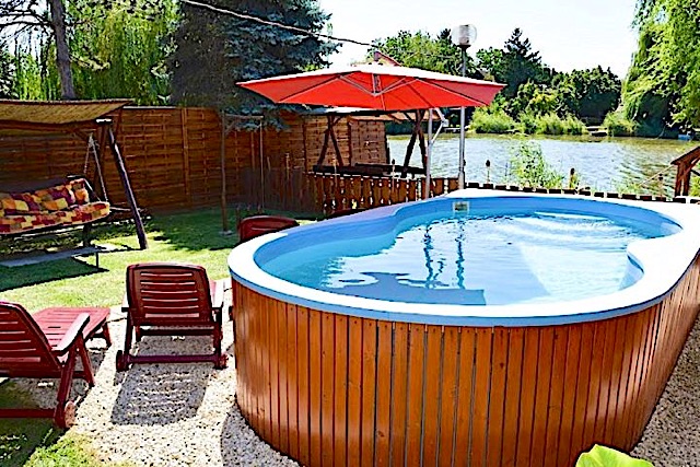 Az épületből kilépve a hangulatos esti beszélgetések helyszínére a fedett teraszra érkezünk, melyből kilátás nyílik a hátsó udvaron elhelyezett 5×3 méteres fürdő medencére és a közvetlen vízpartra.