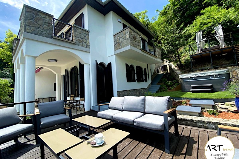 Művészet, nyugalom és felejthetetlen környezet A teljeskörűen felújított és újjáépített ART Trend Luxury Villa várja vendégeit Tihanyban. Fantasztikus panoráma, tökéletes nyugalom és csend, mindez az Apátság alatt, egy zsákutca végében. A villa 4 hálószobával, 2 fürdőszobával, egy nappali-konyha-étkezővel és több, mint 110m2, panorámás, több szinten elhelyezett terasszal rendelkezik. 8 fő részére nyújt kényelmes pihenést, az egyik szobában gyerekágy is elhelyezhető 3 év alatti kisgyermek részére.