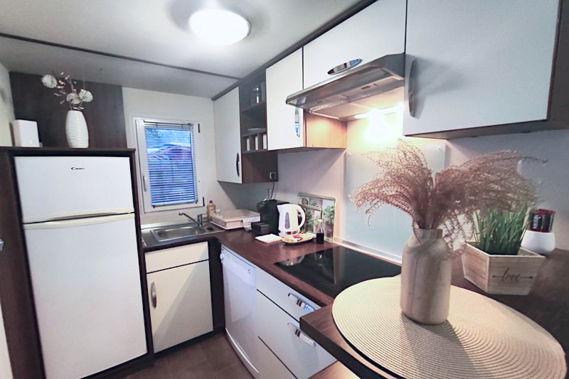 A klimatizált mobilház 36m²-es. A házban két hálószoba magas komfortú fekvőbetétek, ágynemű, ágyneműhuzat, nappali kanapé, étkezőasztal, TV fürdőszoba zuhany, mosdó, WC, bidé, ruhásszekrények, fogasok, gyerekjátékok, társasjátékok, könyvek, jól felszerelt konyha, mikrohullámú sütő, indukciós főzőlap, mosogatógép, hűtőszekrény fagyasztóval, vízforraló, szendvicssütő, konyhai eszközök, edények, kávéfőző.