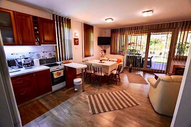 Az emeleten 3 klimatizált szoba és egy fürdőszoba helyezkedik el WC-vel ellátva. A földszinten nappali, konyha, étkező egy légtérben került kialakításra. A konyha teljesen felszerelt. A földszinten egy fürdőkáddal üvegparavánnal, mosdóval ellátott fürdőszoba, külön helyiségben WC, valamint egy tároló helyiség található. A házban szúnyoghálók, internet és vezetékes ivóvíz is van. A 22m2–es fedett terasz.