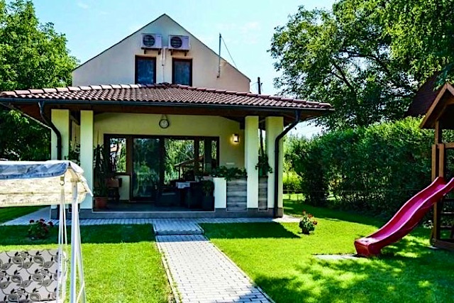 Az udvaron napozóágyak, hintaágy, szolár zuhanyzó, gyerekjátszó is megtalálható. Az udvar 3 autónak biztosít parkolási lehetőséget.