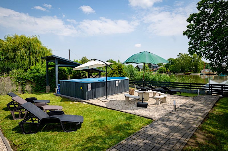 A zárt udvaron föld feletti medence, 5 személyes jakuzzi, napozó ágyak, napernyő, fa játszótér 10éves korig, bográcsozó, pingpongasztal. A vízparton nagyméretű stég, csónak, vízibicikli, parti világítás. Wifi. Vendégházunk önellátó.