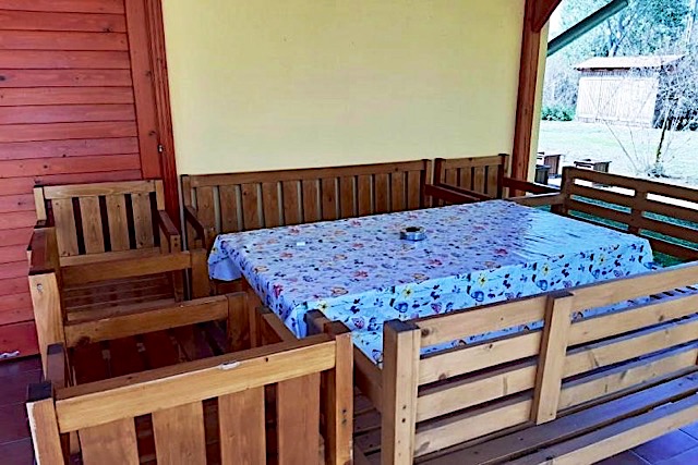 Hatalmas szabad terület biztosítja, hogy nagy családok vagy társaságok is kényelmesen, egymás zavarása nélkül pihenhessenek. Fedett teraszunk fa kerti bútorokkal berendezett.