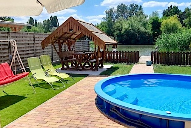 Gyönyörű parkos -fás környezetben messze a közúttól, saját medencével az udvaron, jakuzzival, nagy stéggel, csónakkal, közös vízi biciklivel, kenuval kiadó, amik az árban benne foglaltatnak.